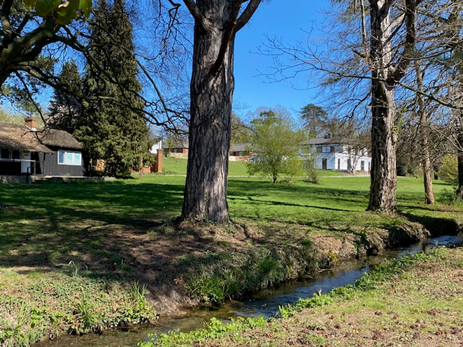 View of Cobdown House from western bridge showing the Grade II Finnish Olympic Sauna and rear annex offices where Advo staff currently work.